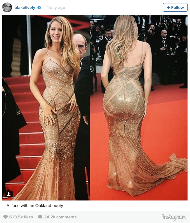 Oops! Parece que una fotografía publicada por Blake Lively en su Instagram está dando mucho de qué hablar en las redes sociales. Ayer, la actriz publicó una foto de uno de sus looks en la alfombra roja de Cannes que decía: "Rostro de L.A. con retaguardia de Oakland," que es parte de la letra de la canción "Baby Got Back", de Sir Mix- A- Lot.